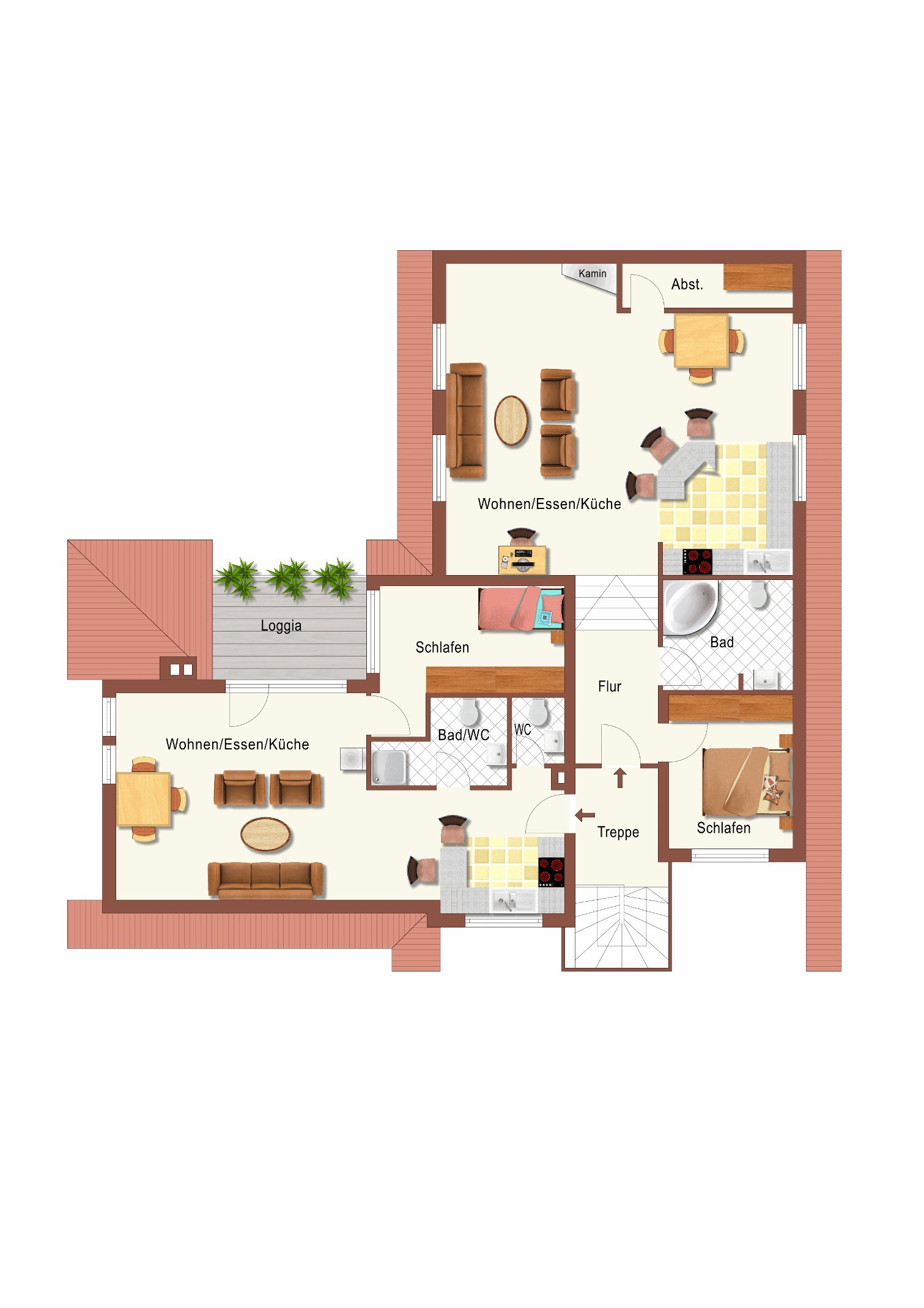Durch die vorbeschriebene Aufstockung sind im OG zwei ca. 70 m² bzw. 75 m² große Wohnungen entstanden. Diese waren bis jetzt vermietet, das Haus wird mieterfrei übergeben. Beide Wohnungen sind einem einem gepflegten, dem Baujahr entsprechenden, Zustand und können sofort bezogen oder vermietet werden. Beide Wohnungen vermitteln durch die enorme Raumhöhe ein tolles Wohngefühl. Die größere der Wohnung verfügt zusätzlich über einen Innenkamin. Jeder der Wohnungen ist mit einer Einbauküche ausgestattet.