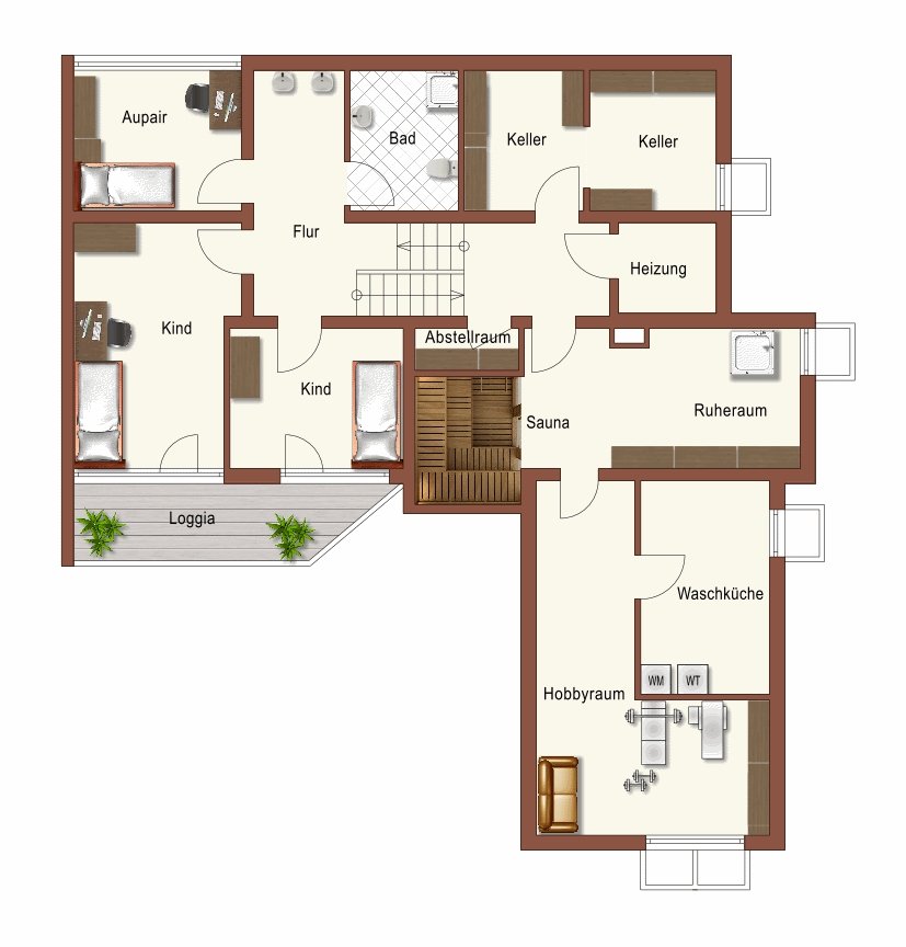 Diese Einheit kann vielfältig genutzt werden. Ob Wohnen und Firma unter einem Dach, Großfamilie oder mit Au-pair. Weitere ca. 75 m² beheizte Fläche stehen dem jeweiligen Nutzer für Hobbys, Fitness, als Sauna und Ruhebereich sowie zur Kellernutzung zur Verfügung.